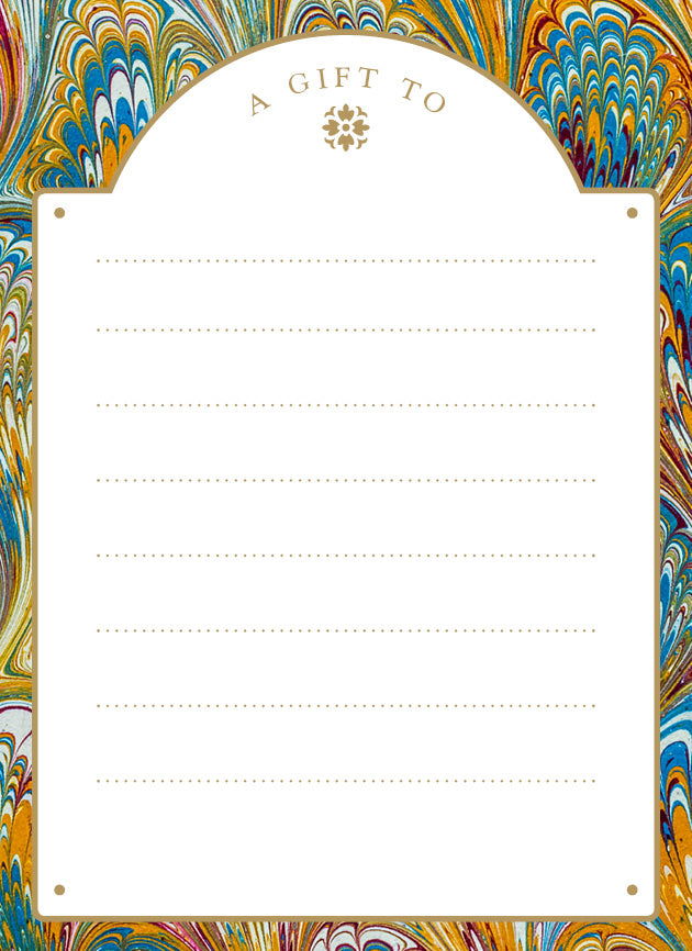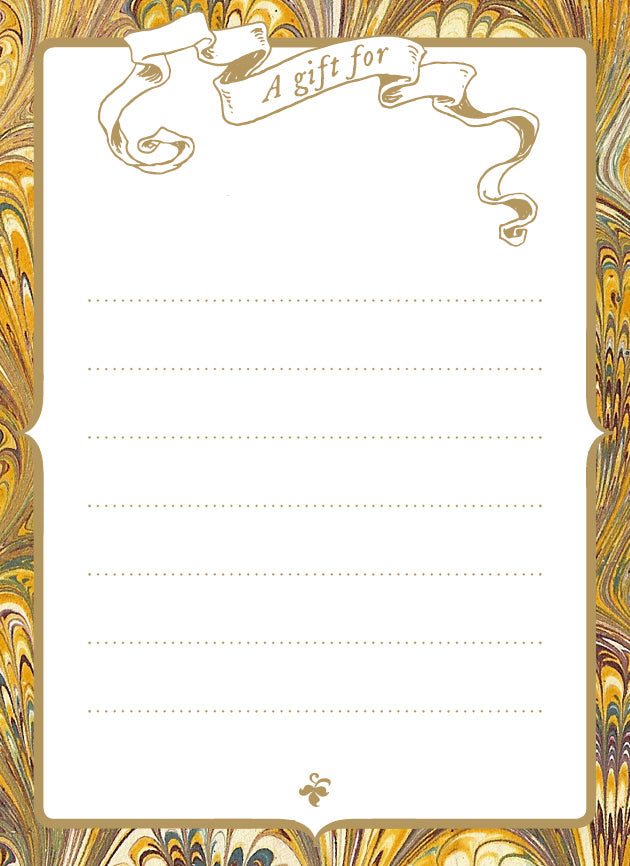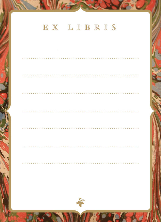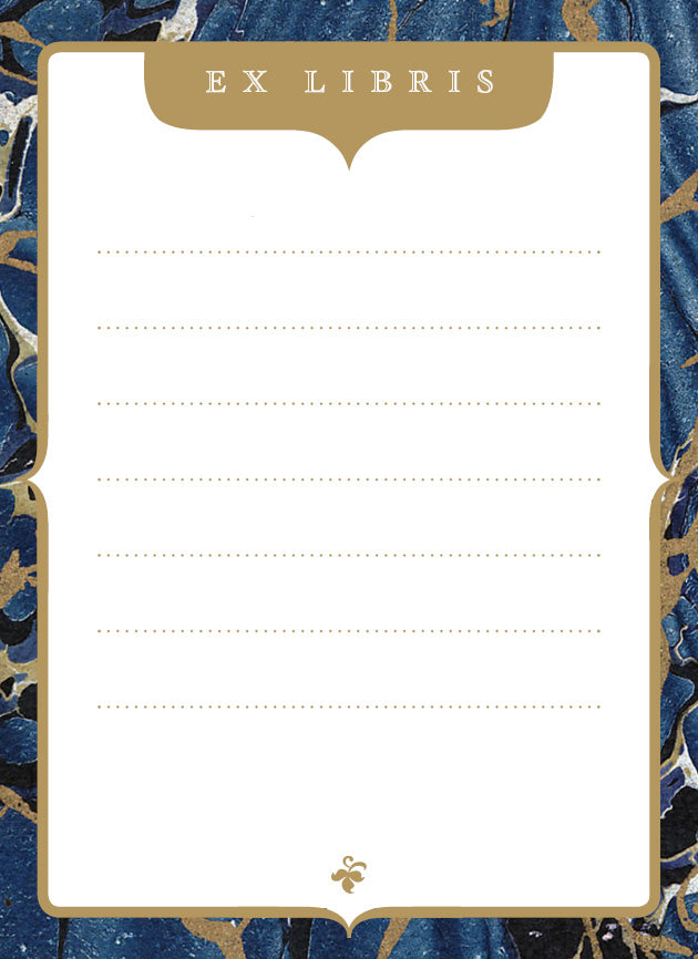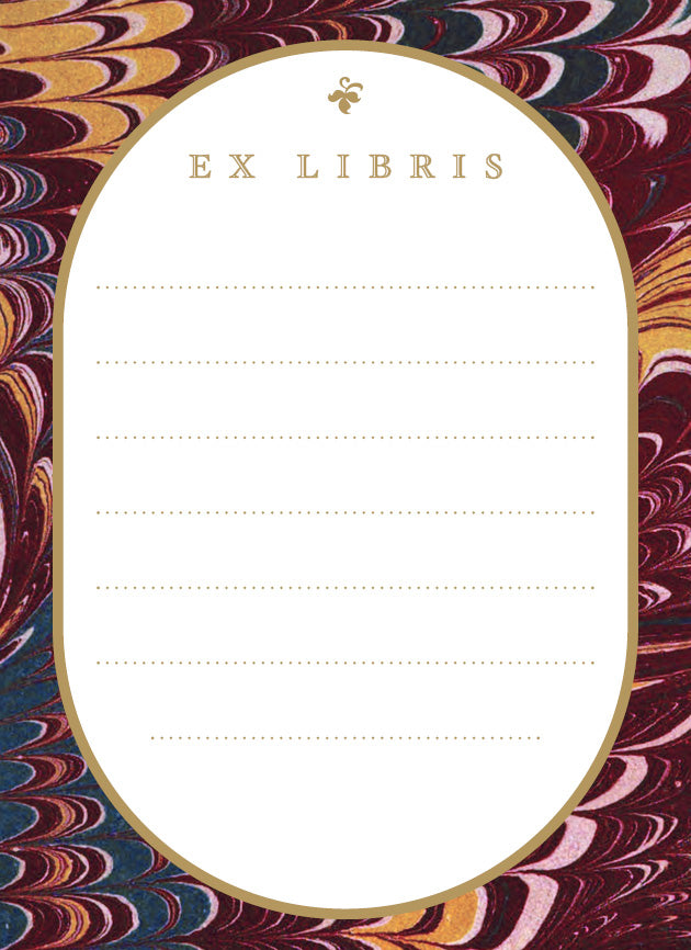 Bookplates, or ex libris (Latin for 'from the library of'), are used to identify the owner of a book and have been used since the 1400s. This vintage bookplate style is inspired by the marbled endpapers in old books.