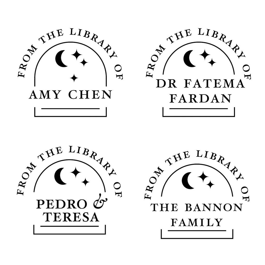 Design: 'From the library of' with arched frame, moon and stars and your name in the middle.